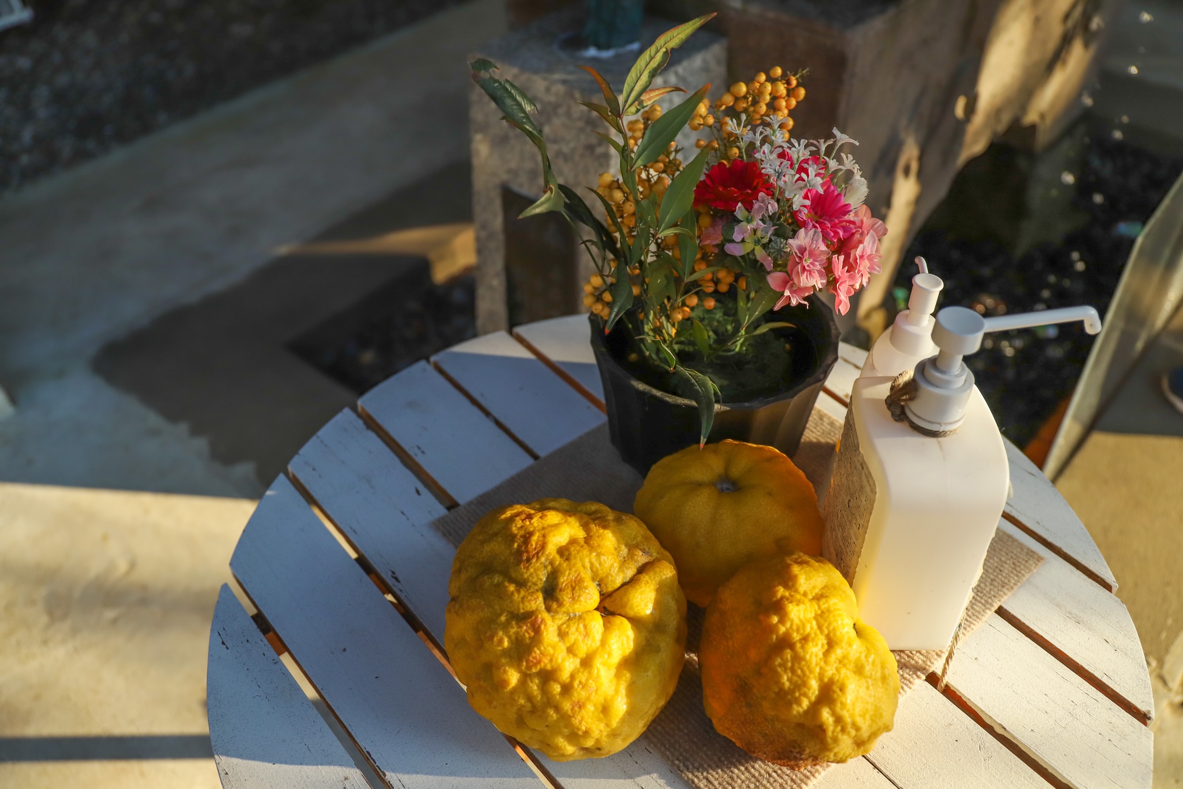 手水舎の脇にあるアルコール除菌スプレーが設置されたテーブルには冬至を連想させる柚子と小さなお花が飾られていました。