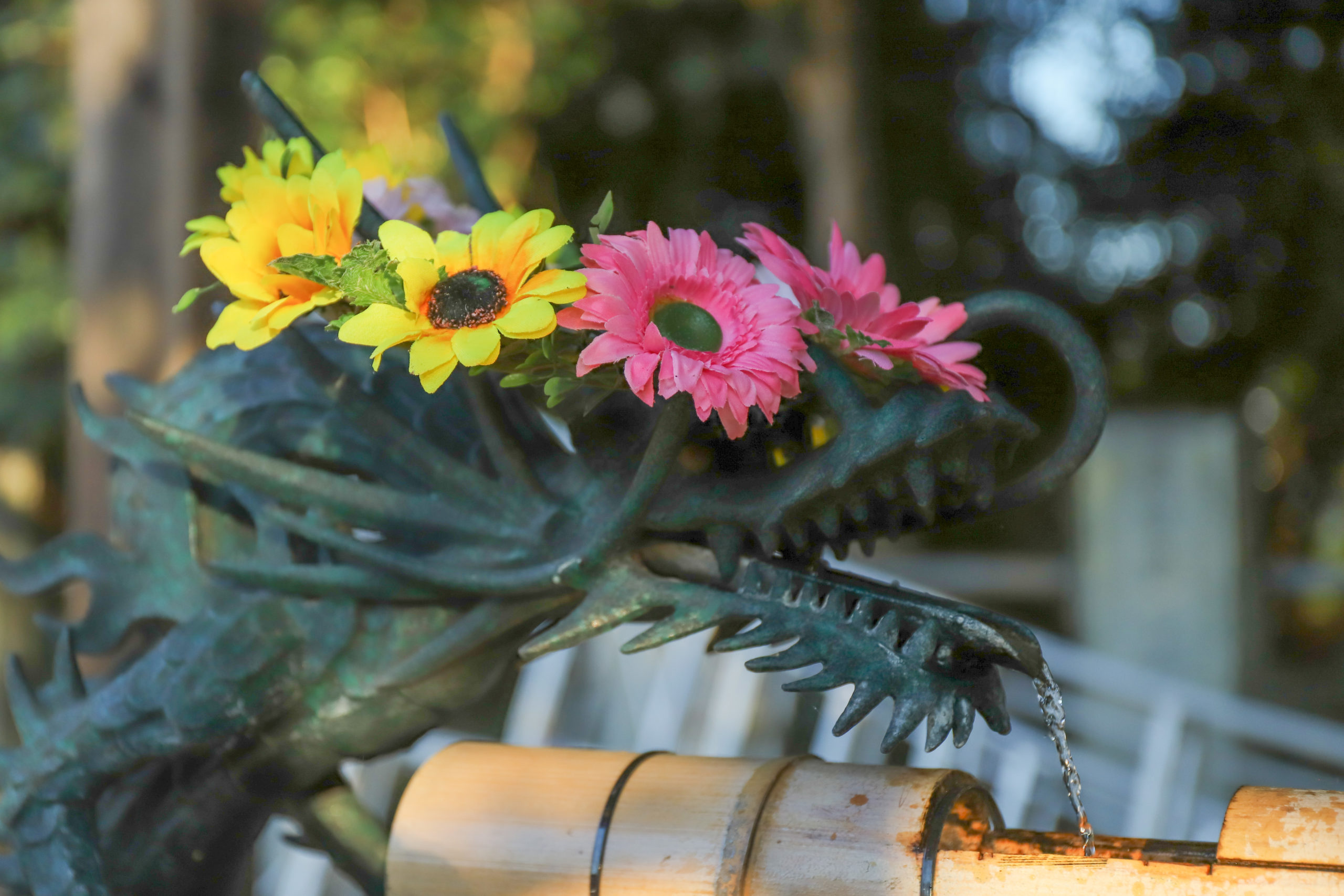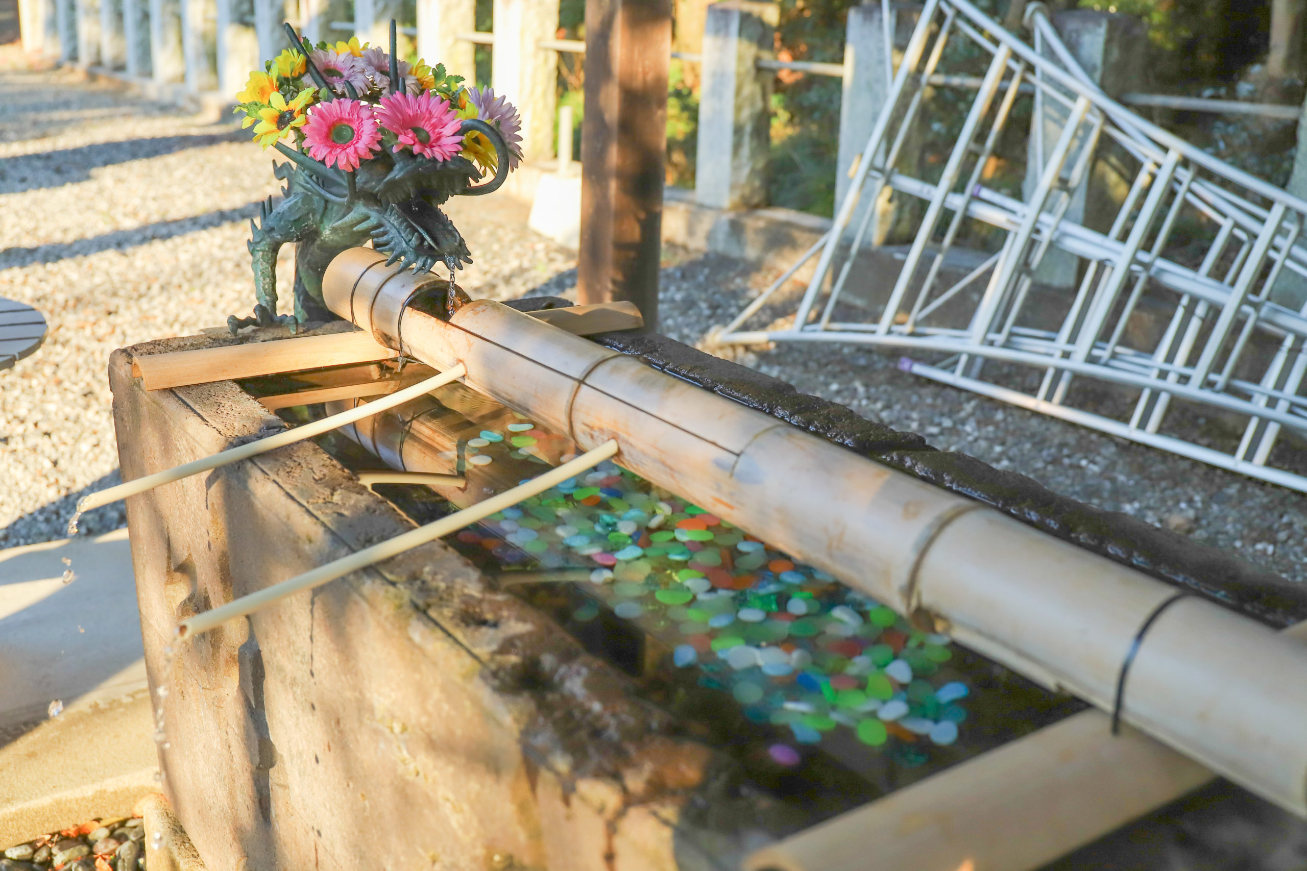 再訪した時の手水舎。手水舎の水盤の中にカラフルな石が敷き詰められていたり、龍が花冠をしていたりと彩られていました。
