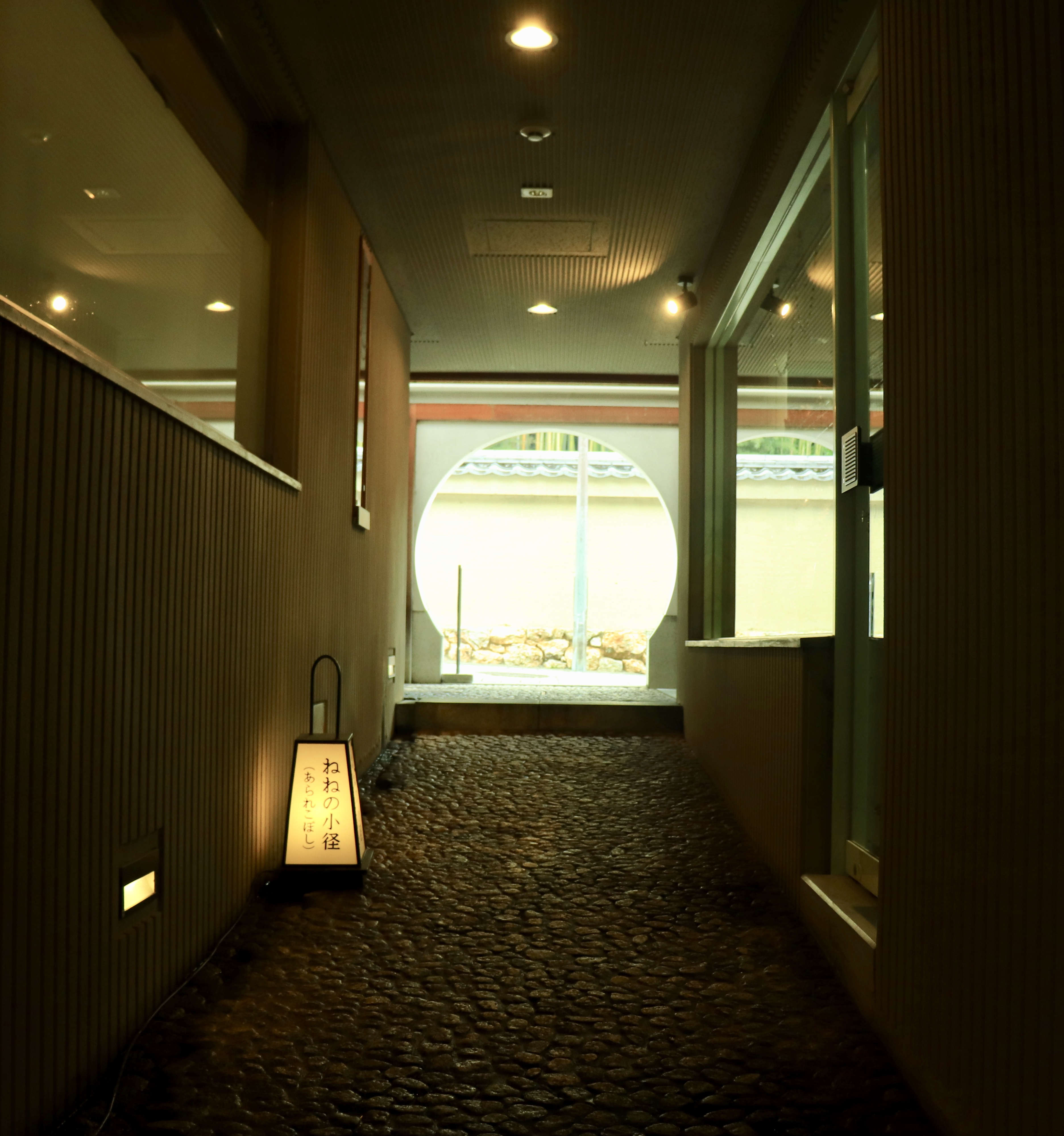 その中でもあられこぼしと呼ばれている、玉のような敷石が敷き詰められた場所はとても素敵な場所です。この写真の左右のガラスのある場所はお土産やさんになっています。