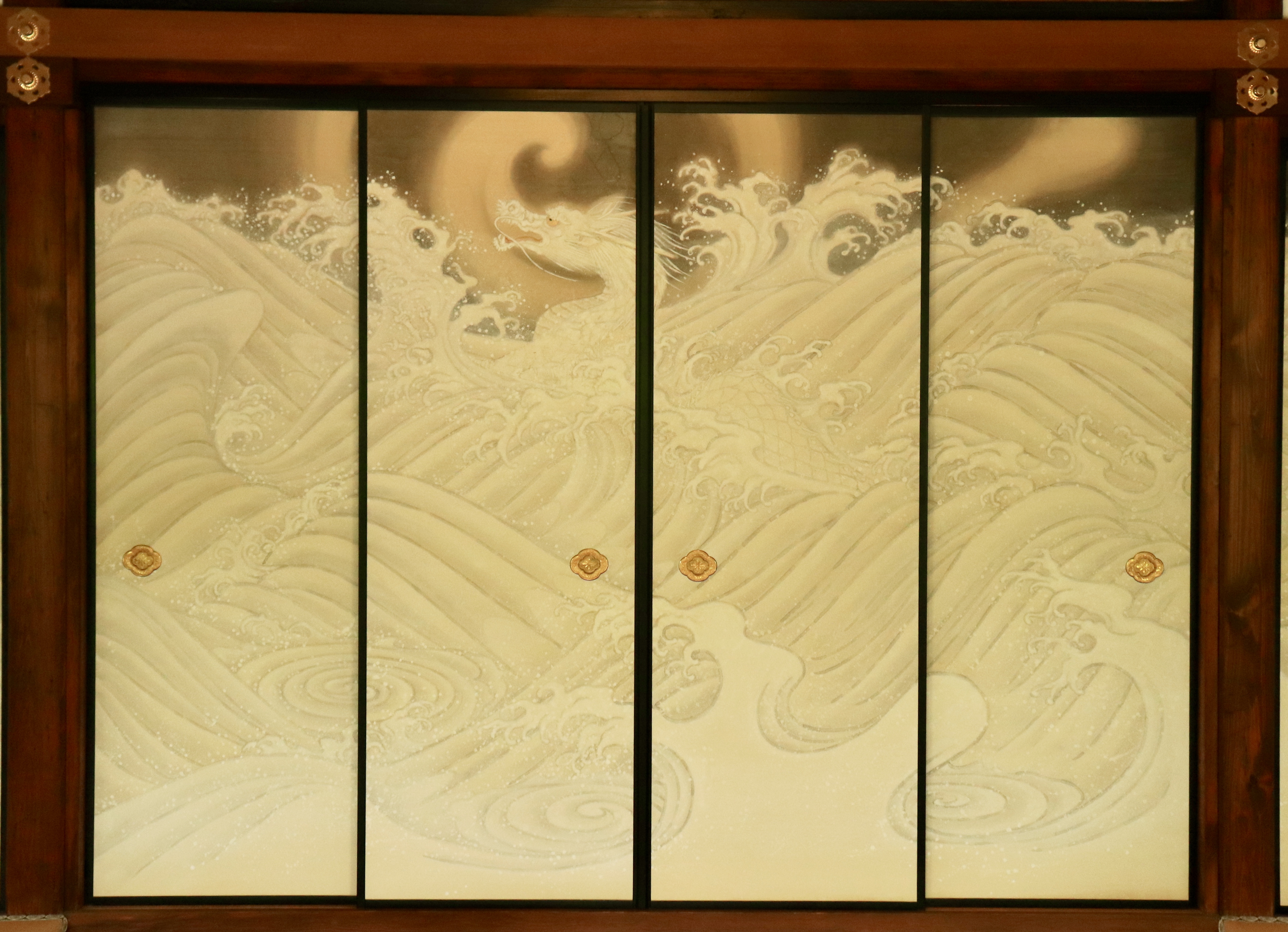 4枚の襖に描かれた、大きな白龍。荒波の中にいるような姿に感動しました。